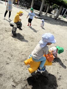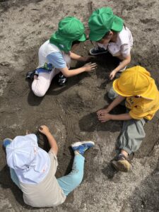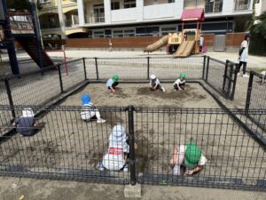公園では砂で山を作って遊ぶこども達😊