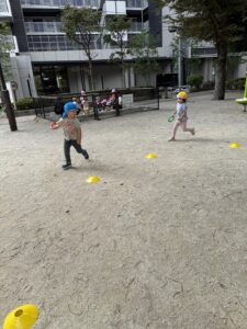 公園ではみんなでリレーのコーナーの走り方を練習しました!