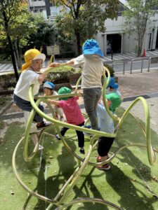 ジャングルジムで「○○ちゃんこっちに一緒に座ろ~」とお友達を誘ったり