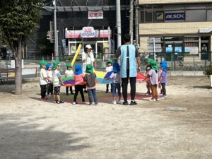 4・5歳児さんは、最初にパラバルーンの練習をしました。最初は保育者も一緒に入りましたが、徐々に子どもたちだけで挑戦💪