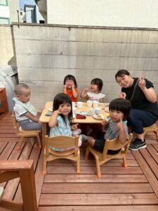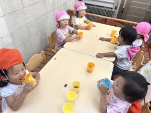 室内ではままごと遊びが盛り上がり、ままごとを通して子どもたちの成長を感じる場面が増えています。以前は一人でお皿に食べ物を並べていた子も、今では『ごはんどうぞ』『ジュース作ったよ』と友だちとやり取りをしながら遊ぶ姿が見られるようになりました🌟ごっこの中で役になりきる楽しさを味わいながら、言葉のやりとりや思いやりの気持ちも育まれています。