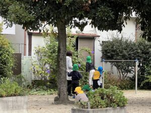 地面にはたくさんのどんぐりが落ちていて、夢中になって拾う子どもたち。