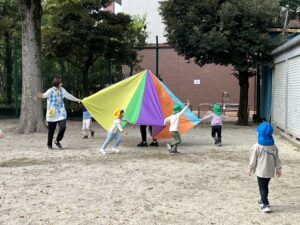 また、運動会の余韻あそびとして、3・4・5歳児でやりたい子が集まり、パラバルーンにも挑戦🎈