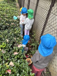 虫探しをしていた子たちはダンゴムシやコオロギ、クモを見つけて大喜び♪紅葉している落ち葉にも興味を持ちながら遊んでいました🍂