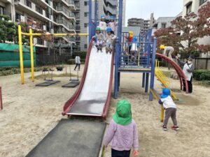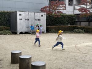 みんな大好きな滑り台では、お友達と何かを言いながら滑るのがブームになっていて、1組の声をよく聞いていると「宇宙防衛隊!!!」と大きな声で言っていました。「何それー?」と言っていると、他の子が「ウルトラマンだよ!」と教えてくれました!なるほど!🤭
