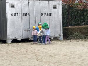 広場の方では5歳児さんと3歳児さんが何やら相談中…