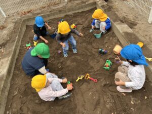 砂場ではバケツの中で山作りをしていました⛰️大きくできると飾りつけをしたり、アイスクリームを作っているお友達と合わせたものを作っていました!帰るときにはバケツをひっくり返してプリンを作り飾りつけをしてから保育園に帰りました🍮🍂
