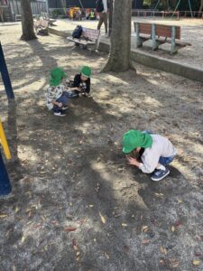 地面に絵をたくさん描いたり、友達と山を作って高さを競ったり、今日も元気いっぱい遊んでいました!