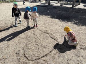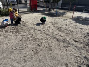 地面に絵をたくさん描いたり、友達と山を作って高さを競ったり、今日も元気いっぱい遊んでいました!