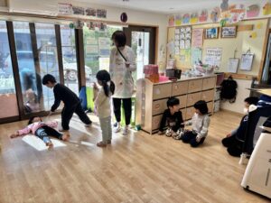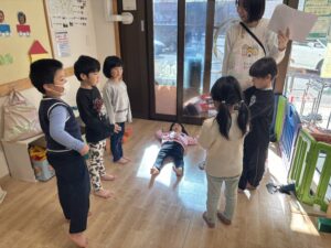始めて練習をする子は最初「恥ずかしい…」と言いなかなか声を出して演技ができなかったのですが、小さい声で練習を始めてやっていくうちにだんだんと声が出せるようになり楽しく参加することができていました😊