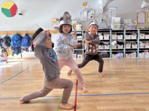 4歳児はダンスをしたり、セリフを言ったり、劇遊びをしました。ここ数カ月でダンスがとても上手に踊れるようになり、楽しく参加できるようになったので、発表会のダンスも意欲的に取り組んでいました! 以前、「発表会で何したい?」と聞いた時も、「ダンスしたい!」と子どもたちから声が上がるほどでした! セリフは恥ずかしくて声が小さくなってしまう子もいましたが、何度か一緒に練習するうちに少し大きく言うことができるようになりました。発表会では、子どもたちが自信をもって楽しめるようにしたいです♪😊