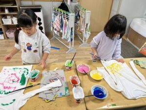 真っ白な服に絵の具を使って、思い思いの絵を描いていきました🎨🖌️