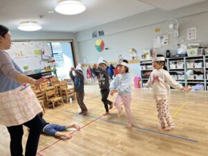 4歳児はダンスをしたり、セリフを言ったり、劇遊びをしました。ここ数カ月でダンスがとても上手に踊れるようになり、楽しく参加できるようになったので、発表会のダンスも意欲的に取り組んでいました! 以前、「発表会で何したい?」と聞いた時も、「ダンスしたい!」と子どもたちから声が上がるほどでした! セリフは恥ずかしくて声が小さくなってしまう子もいましたが、何度か一緒に練習するうちに少し大きく言うことができるようになりました。発表会では、子どもたちが自信をもって楽しめるようにしたいです♪😊