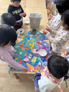そして劇の後は、クリスマスツリーのオーナメント作りの続きをしました。今日はキラキラのホイル折り紙を使ったので、みんな興味津々✨ ハサミを使って、三角や四角、ハートやリボンなど様々な形を作っていました♪ とってもカラフルなツリーが出来上がったので、お迎えの際にお子さんと一緒に見てみてくださいね!😊(4歳児さんは真ん中の木です🎄)