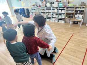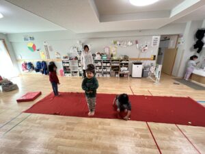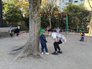 ひと通り楽しむと、次はだるまさんが転んだが始まりました!「〇〇先生がこーろんだ!」などとアレンジしたりして、お友達と面白がりながら楽しんでいました☺️