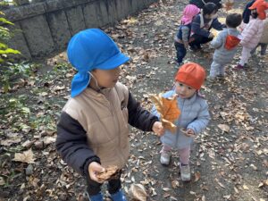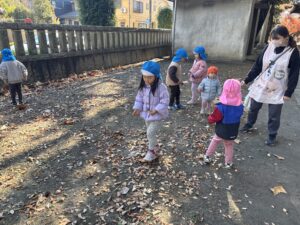 4歳児は、1.2歳児さんと神社公園の境内にお散歩しに行きました!