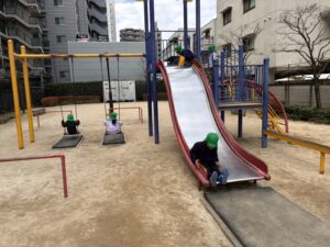 公園では大きな滑り台に大興奮!繰り返し滑って遊ぶうちに「○○ちゃん、○○ちゃん出発!!!」と名前を呼びながら滑ることを楽しんでいました🎵
