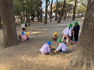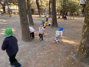 今日は神社公園に行きました!「遊具のほうで遊びたい!」と言っていたのですが、他の保育園がいたので今回は境内で遊ぶことにしました!