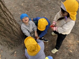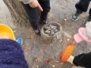 切り株がある場所では葉っぱや石を集めてジュース作りです🍹「先生飲みにきてー!」と言われ行ってみると『石のごつごつジュース』がありました!どうやって飲もうか考えていると「今持ち上げるから待ってて!」とみんなで協力して切り株を持ち上げようとしている姿が可愛かったです😊💕