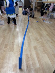 おもちゃ遊びの方では、プラレールの線を長く繋げて先端を曲げ、電車を走らせて曲がったレールに当てるゲームをしていました!(ボウリングのような感じです!) 面白そうでやりたい子がどんどん集まってきましたが、先生が言わなくてもみんなきちんと列を作って順番に楽しんでいました😊