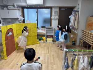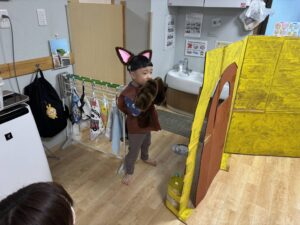 劇ごっこは5歳児さんが発表会でおこなった“オオカミと4匹の子やぎ”をしました!5歳児さんに衣装を借りて、3、4歳児さんはとっても嬉しそう♪ 5歳児さんもお友達の衣装を借りて自分がやった役とは違う役に挑戦! 大道具も自分たちで動かして、みんなとても楽しそうに演じていました✨😊