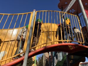 大きな滑り台はトンネル状になっており、前のお友だちが滑り終わったか分からない場面もありましたが、「いーい?」「いいよー!」と自然に声を掛け合いながら、順番を守って遊ぶ姿が見られました☺️