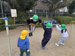今日は鉄棒が人気で、お猿さんのようにぶら下がったり、足抜き回りをしたり、登ったまま低い段から高い段に移動したり、いろんな方法で楽しんでいました!「手が痛い!!」と怒っていた子がいたので「休憩したら?」と言うと、「まだやるの!」と意欲的に挑戦していました🔥