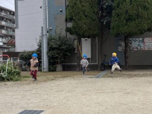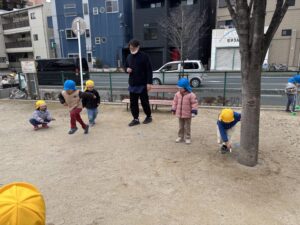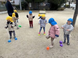 公園に着いてからは、ぽっくりと縄跳びを出して遊びました。ぽっくりはみんな上手に扱えるようになり、「あそこの木まで!」「○○先生のところまで!」と目標を決めて友達と一緒に楽しんでいました😊 縄跳びは蛇のように波を作って友達に飛んでもらったり、しっぽ取りのように友達の縄を追いかけたりして遊んでいました♪ とっても寒くて動けなくなってしまう子もいましたが(笑)、みんなお友達と楽しそうに遊んでいました😊