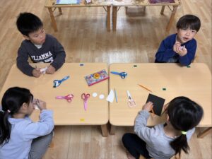 目の大きさを同じにするために紙を重ねて切る方法を伝えると、「すごい!!!」と目を輝かせながら集中して取り組む姿が見られました。