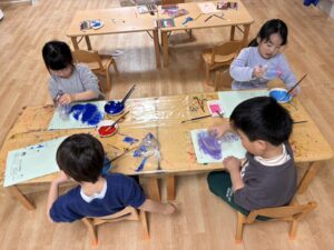 袋を使った絵の具のスタンプに興味津々の子どもたちは、色の混ざり方や形の変化を楽しみながら、一つひとつ丁寧に色を付けていました。