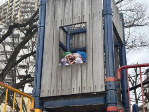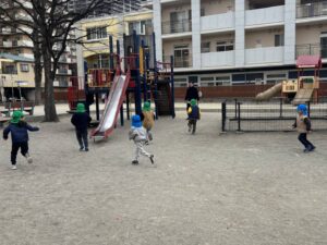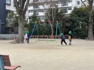 外に出ると寒さでみんな悲鳴を上げていました🥶 体を温めるために、公園に着いてみんなでその場でダッシュ!🏃 温まったところで自由遊びにすると、ダッシュをして走る気持ちが高ぶったのか、すぐにみんなで鬼ごっこを始めていました🤭 鉄棒では、様々な技に挑戦!鉄棒に座れる子がいると、「羨ましい!やってみたい!」と周りの子も挑戦をしていました😊 「先生、鉄棒が冷たくて手も冷たくなっちゃた!」と言ってきたので、手を触ってみると驚くほどキンキンに冷たくなっていました❄😲 それでも「大丈夫だよ!もっとやる!」と意欲的な子どもたちでした♪ 他にも、かくれんぼやだるまさんが転んだをしたり、サザンカの花びらを枝に刺したり、並べて果物の形を作ったりして遊びました! 寒すぎたので、何度か子どもたちに「そろそろ帰る?」と声を掛けましたが、誰一人「帰りたい」と言わず、時間いっぱいまで存分に楽しんでいた子どもたちでした😂