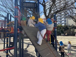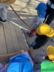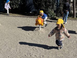 お散歩組は希望者のみで本町公園へ!なんと遊具のふもとに凍った場所を発見!「雪だ!」「すごい!」と興味津々でした👀 しばらくして、最近流行っているかくれんぼが始まりました。やる度に隠れるレベルが上がっていて、みんな息を潜めるように隠れられるようになりました!特に今日は5歳児の子が全く見つからず先生たちもビックリ!遊びの面白さが広がっています♪😊