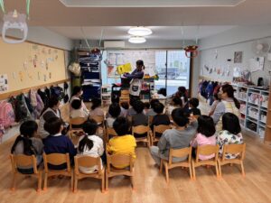 幼児さんは、自分たちで作った鬼のお面を被り、「これ作ったよ!」「この鬼かわいいね」と友達同士で見せ合いながら、嬉しそうな表情を見せていました。