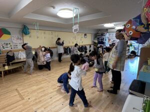「がおー!」と近づきつつも、乳児さんが豆を投げると「やられた〜!」と優しく倒れてくれる姿に、周りからは笑顔があふれていました。
