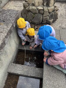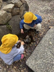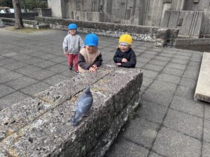 走ることに満足すると、それぞれ興味がある遊びへ! ボウリングの玉を見つけた子たちは「恐竜の卵かな?」と観察を楽しんでいました🦖 石の台に登った子たちはそこをステージに見立てて、「これからショーが始まります!!」と歌を歌ったりポーズを決めたりして遊んでいました🎵 鳩に興味を持った子たちは追いかけたり追いかけられたり、鳩の反応を楽しんでいました🕊 水たまりを見つけた子たちは穴を開けた落ち葉を浮かべ、枝を使って魚釣りを楽しんでいました🐟