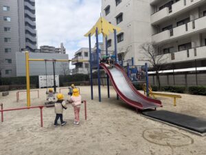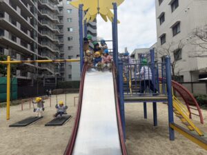 遊具では、お友達と仲良く並んで滑り台をシューッ🛝✨