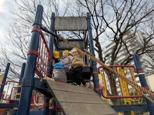滑り台では、「一緒に滑ろう!」と声を掛け合いながら、仲良く何度もシューッと滑って大盛り上がり😊💕