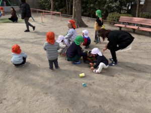 公園へ出かける時には、「〇〇ちゃんと一緒に手をつなぎたい!」と声を掛けられ、少し照れながらも嬉しそうに手をつないで出発する5歳児さんの姿が見られました。