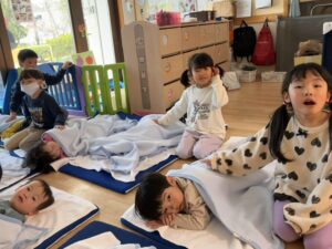 お昼寝の時間には、たんぽぽさんやももさんのそばに行き、優しくトントンして寝かしつけてくれる姿も見られました。