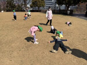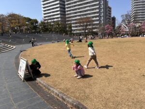 広場には隠れる場所が少ない中で、先生の後ろにそっと隠れたり、植木の陰を上手に使ったりと、それぞれ工夫しながら楽しんでいました🎵