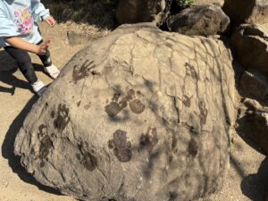 一人が小石をもち濡らしてスタンプして遊んでいて