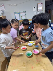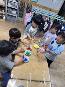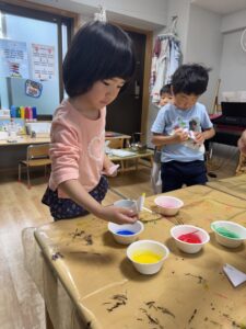 絵の具を選び障子紙を色水に浸して思い思いの色に染めてみました🌟紙に色が滲む様子や色が混ざりあう様子を見ながら楽しんでいました。