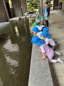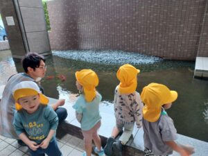 その後は本町4丁目公園に行き、体を動かしました。途中で通り雨が降って来たので近くの池に鯉を見て雨宿りしました。その時に鯉は鯉のぼりの魚だよ。伝えると「ホントだ!模様一緒だよね」と話ながらマジマジと見ていました。なかには「美味しそうだね」というお友だちいて思わず笑ってしまいました。