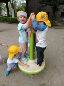 回転遊具では何人かが乗り、何人かで回してあげて