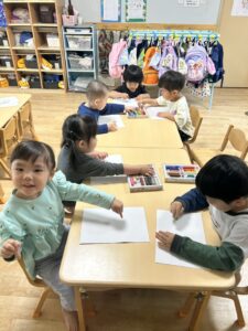 3歳児はお絵描きをして遊びました🖍️「大きい丸描いたよ〜」と好きな色を手に取り伸び伸びと描いていました🎶保育者も一緒に描いてみるとお顔には目や髪の毛があること、「体もあるよ!!」と教えてくれる姿もありました😊久しぶりにお絵描きをすると「もっと描きたい!!」と2枚目も自由にお絵描きして楽しんでいました🎶