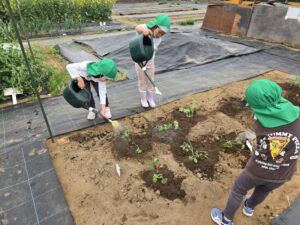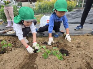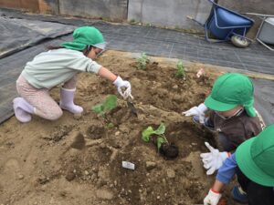 畑の虫にキャーキャー反応しながら、雑草抜き・苗植え・水やりを体験してきました。実ったら「また来ようね!」と言ってくれるほど頼もしいみどり帽子さんでした。畑には誰も居なかったので、あちこち色々な野菜を見ながら探索してきました。