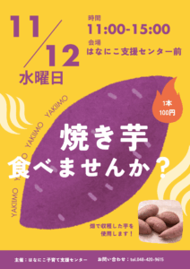 まだまだ秋のイベントは続きます。11/12(水)には『焼いも屋さん』を行い、はなにこ保育園の前で